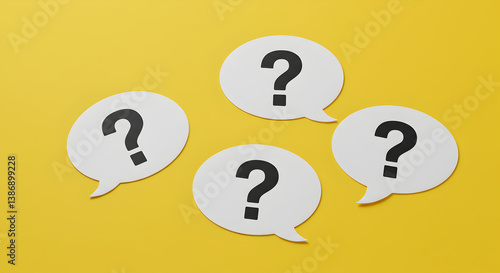 Four White Question Mark Speech Bubbles on a Bright Yellow Background Depicting Inquiry and Communication