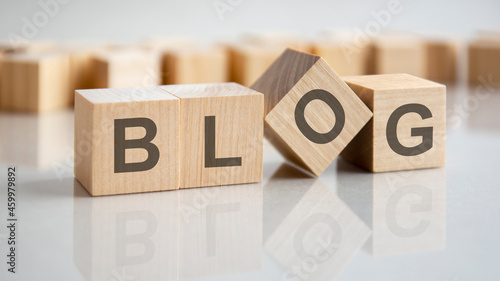 four wooden cubes with the letters Blog on the bright surface of a gray table, business concept