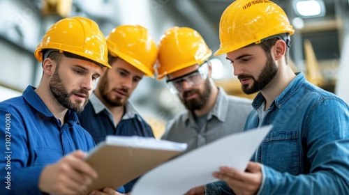 Four workers in hard hats review plans together in an industrial setting, emphasizing teamwork and safety in construction or manufacturing.