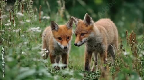 Fox cubs playing in wildflowers natural habitat realistic photograph outdoor setting close-up view nature's beauty