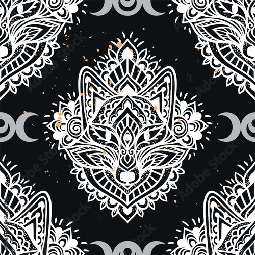 Fox mandala ornament. Vector illustration. Moon Ethnic drawing. Fox animal nature in Zen boho style. Coloring page black and white