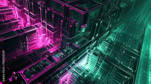 Fractal grid in neon pink and teal with retro-futuristic high-tech design