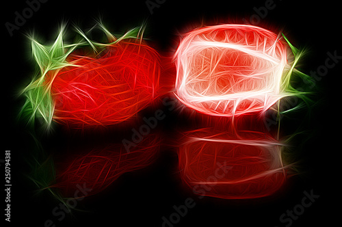 Fractal image of sliced strawberries with a reflection on a contrasting black background
