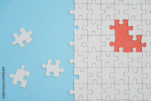 Fragment of a folded white jigsaw puzzle and a pile of uncombed puzzle elements against the background of a blue surface.