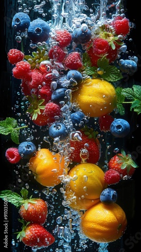 Fragments of fruits and vegetables falling into the water, splashing with water, commercial photography, with a pure black background