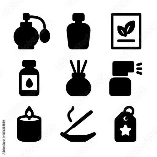 Fragrance Icons Grid. Solid, filled icon set of fragrance personalization: perfume atomizer, scent bottle, fragrance notes card,