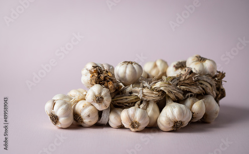 Fragrant Garlic wreath lies on light background. Agriculture and farming