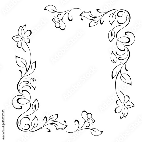 frame 90. unique decorative frame with stylized flowers on stems with leaflets and curls in black lines on a white background