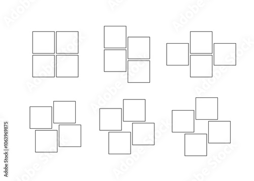 Frame collage from square shape for photo, image template line set. Mood board layout, background. Gallery grid, mosaic puzzle border. Vector outline illustration