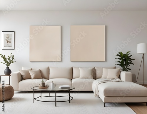 Frame mockup, ISO A paper size. Living room poster mockup. Modern interior design. Living room Interior mockup with house background. 3D render