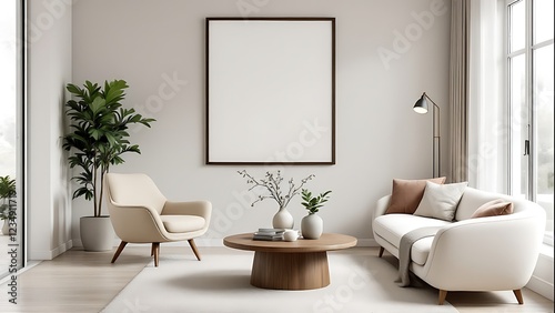 Frame mockup, paper size. Living room wall poster mockup. Interior mockup with house background. Modern interior design.