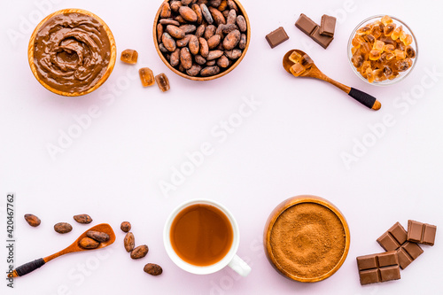 Frame of assorted coffee and cocoa - beans with powder and hot drink. Overhead view
