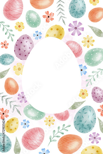 Frame of cute colorful Easter eggs. Paschal Concept with Easter Eggs with Pastel Colors. Isolated watercolor illustration. Design for Easter cards, covers, posters and invitations.