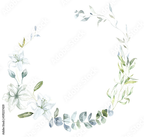 Frame with white Lily Flowers and Eucalyptus. Watercolor Illustration.