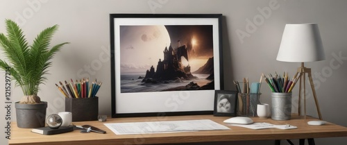 Framed poster mockup on desk with art supplies, office, supplies, hobby