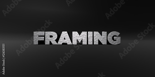 FRAMING - hammered metal finish text on black studio - 3D rendered royalty free stock photo. This image can be used for an online website banner ad or a print postcard.