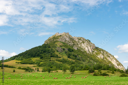 France. Monségur. le chateau de Monségur e nhaut du pog, colline. the castle of Monségur at the top of the pog, hill.