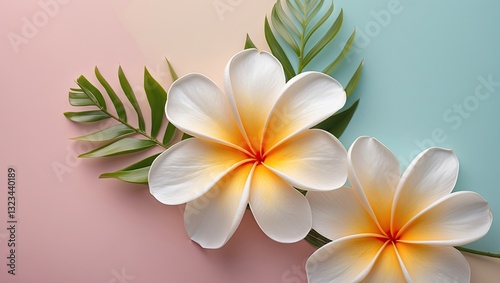 Frangipani flowers with orange centers on a soft pastel background featuring light pink and aqua, surrounded by green palm leaves.
