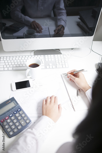 Frau arbeitet am Schreibtisch, schreibt auf Notizblock