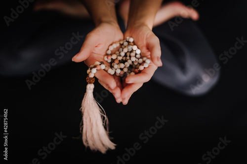 Frau macht Yoga entspannt, kraftvoll, Balance, Üben, Fitness, dunkler Hintergrund, Lichteinfall, Nebel