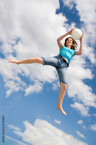 Frau mit einem Ball in ihren Händen springt auf einem Trampolin