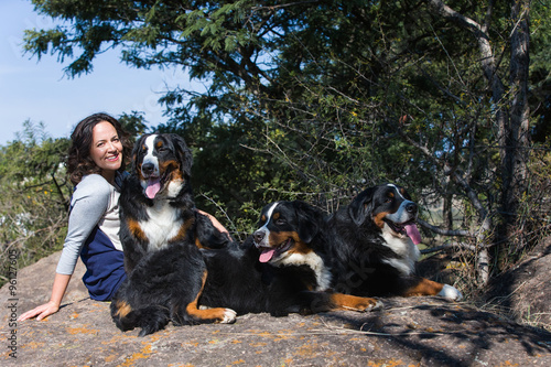 Frau sitzt mit ihren Hunden auf Stein im Wald