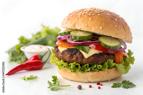 Free Clipping Path Image of Beef Patty Burger with Fresh Vegetables and Lettuce – Isolated on White Background
