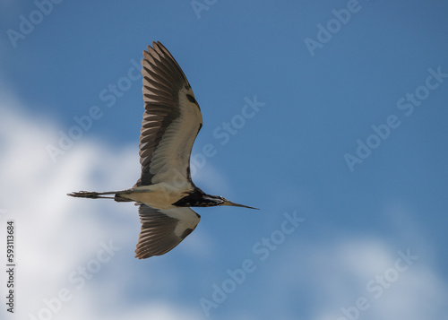 Freedom Flight: A Tricolored Heron raises glides across a cloudy blue sky in Saint Marys, Georgia