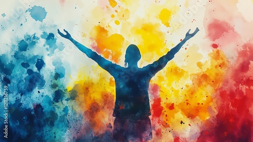 Freedom of creativity, watercolor multicolored silhouette of a person with a colorful paint splash background, symbolizing happiness and creative ideas.