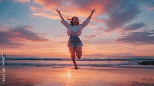 Freedom wellness well-being happiness concept. Happy carefree Asian woman feeling blissful jumping of joy on peaceful beach at sunset. Serenity, relaxation, mindfulness, stress free concepts.