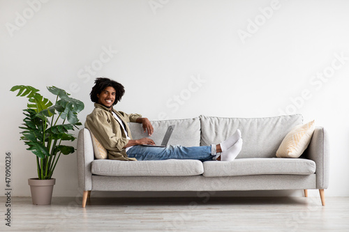Freelance Career. Relaxed Black Man Working With Laptop While Sitting On Sofa