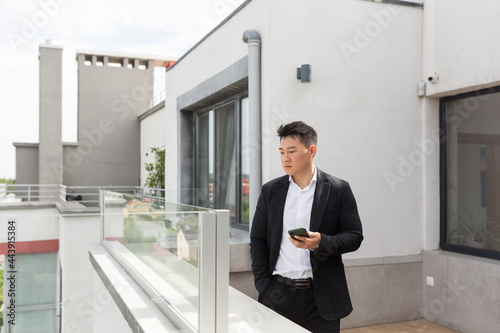 Freelancer Asian businessman in business suit enjoys phone standing on balcony terrace of modern office center