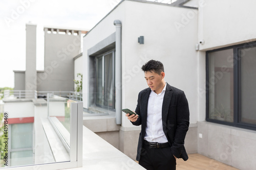 Freelancer Asian businessman in business suit enjoys phone standing on balcony terrace of modern office center