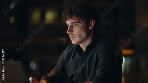 Freelancer working late evening drinking coffee at dark workspace closeup.