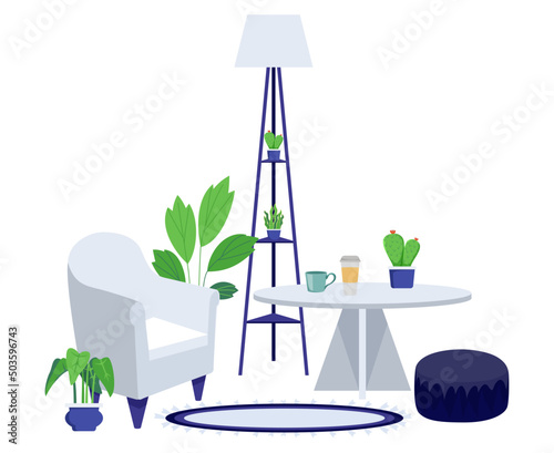 Freelancer workplace with modern sofa and floor lamp isolated on white background