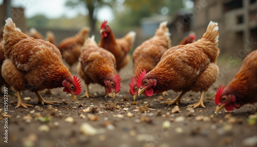 Free-range chickens on organic farm,Happy brown hens feeding on grass in a backyard farm environment with natural fencing