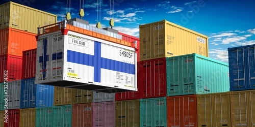 Freight shipping container with flag of Finland on crane hook - 3D illustration