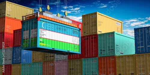 Freight shipping container with flag of Uzbekistan on crane hook - 3D illustration