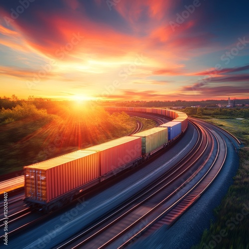 Freight train with containers on blue. Intermodal transport, freight logistics, global export, logistic infrastructure, railway departure, traffic concept, factory shipping, delivery commercial.