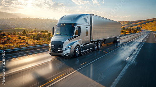 Freight truck on a sunlit rural highway, with open roads and picturesque fields.