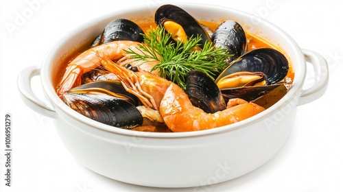 French bouillabaisse, a seafood stew with mussels, prawns, and fish, isolated on a clean white background
