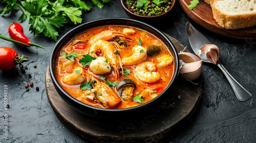 French bouillabaisse with seafood and saffron broth, coastal flavors, Marseille tradition