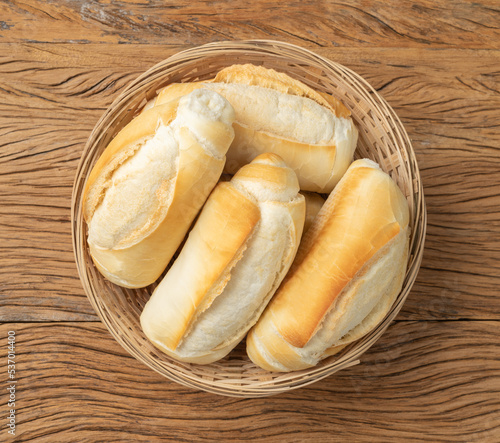 French bread, salt bread or pistolet in a basket over wooden table