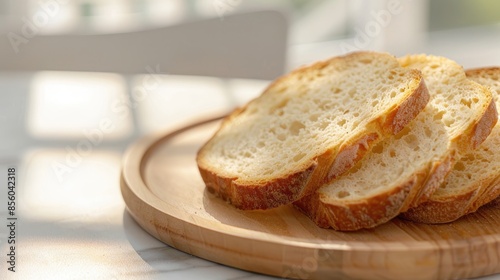 French bread slices on wooden plate with blurred background