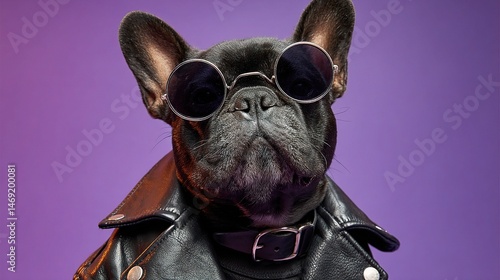 French Bulldog in Leather Jacket Posing Dramatically Against Purple