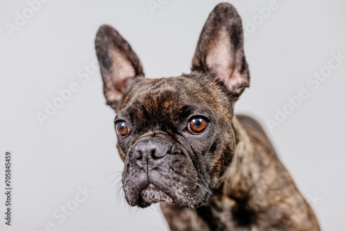 French bulldog on a light isolated background looks at the camera and around with interest. Concept for advertising food, pet care products.