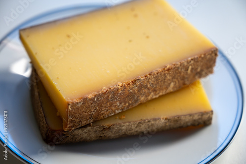 French cheese Comte, varieties unpasteurised ed milk Prestige, fruity flavoured Fruite and Vieille Reserve close up