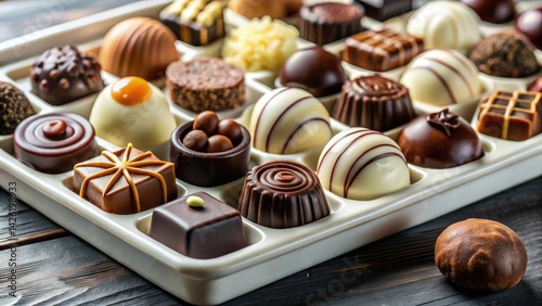 French Chocolate Assortment: Gourmet Dark, Milk & White Chocolates on White Tray