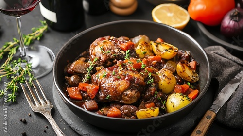 French coq au vin with red wine sauce, rustic meal, culinary sophistication
