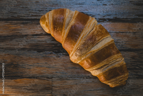 French croissant on wooden tabletop. Fresh croissant on wooden table. Golden baked croissant on wooden background.